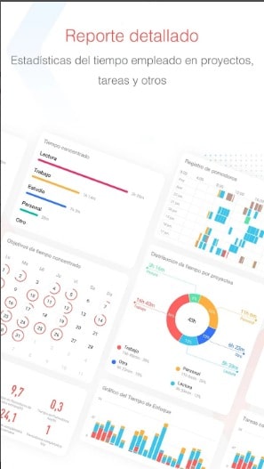 Focus To-Do: Pomodoro & Tareas te permite personalizar el tiempo que dedicas a cada intervalo de trabajo, así como el dedicado a los descansos cortos y largos. Además, puedes visualizar en un gráfico tus progresos para saber cuánto tiempo has dedicado a cada tarea.