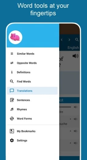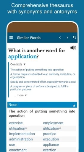 Esta aplicación actúa como un diccionario de elementos múltiples que le permite buscar palabras basadas en definiciones, sinónimos, antónimos, sustantivos, adjetivos y otras referencias para proporcionarte las palabras correctas para el escrito.